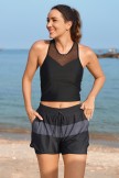 Cet ensemble de bain élégant et fonctionnel comprend un débardeur noir élégant avec un empiècement en maille flatteur à l'encolure, offrant une touche respirante et moderne. Le shorty taille haute est doté de poches pratiques, d'une ceinture élastique pour un ajustement parfait et d'une large rayure contrastée qui ajoute une touche sportive au design.
