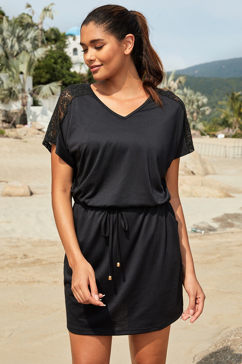 • Solid Black V Neck Lace Drawstring waistband Beach Dress